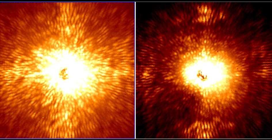 Image Caption: Two images of HD 157728, a nearby star 1.5 times larger than the Sun. The star is centered in both images, and its light has been mostly removed by the adaptive optics system and coronagraph. The remaining starlight leaves a speckled background against which fainter objects cannot be seen. On the left, the image was made without the ultra-precise starlight control that Project 1640 is capable of. On the right, the wavefront sensor was active, and a darker square hole formed in the residual starlight, allowing objects up to 10 million times fainter than the star to be seen. Images were taken on June 14, 2012 with Project 1640 on the Palomar Observatory's 200-inch Hale telescope. (Courtesy of Project 1640)
