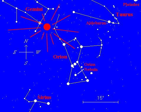 - The radiant is at RA=06h20m, DEC=+16o, just above the left shoulder of Orion.
