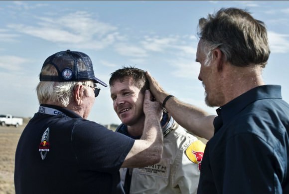 Caption: Technical Project Director Art Thompson and Capcom 1 USAF Col Joe Kittinger of the United States welcome Pilot Felix Baumgartner of Austria during the second manned test flight for Red Bull Stratos in Roswell, New Mexico, USA on July 25, 2012. Credit: Red Bull Stratos.