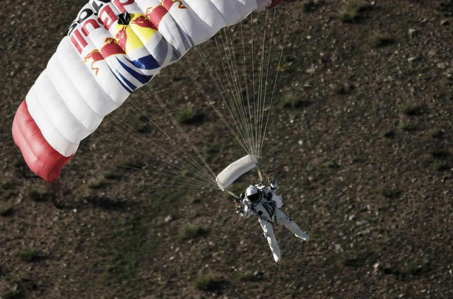 Caption: Pilot Felix Baumgartner of Austria lands in the desert during the second manned test flight for Red Bull Stratos in Roswell, New Mexico, USA on July 25, 2012. Credit: Red Bull Stratos