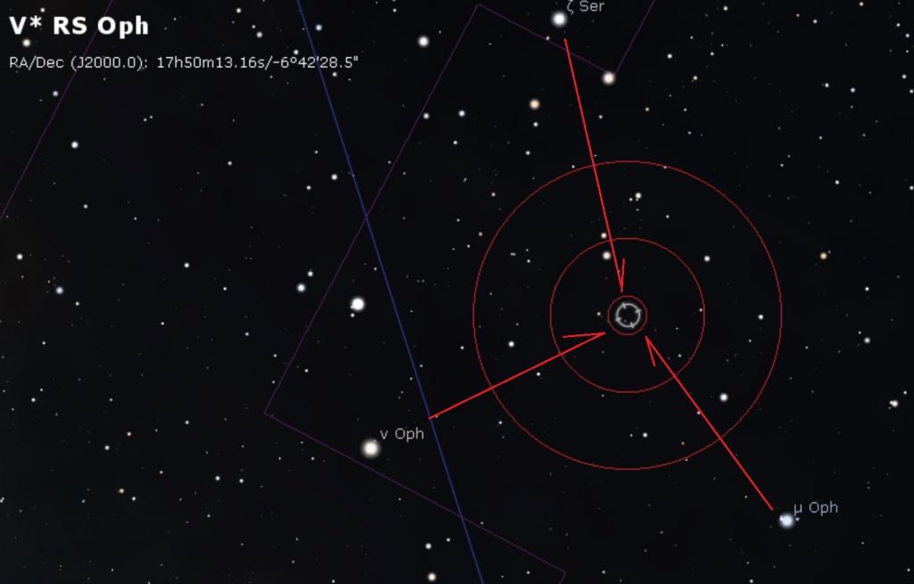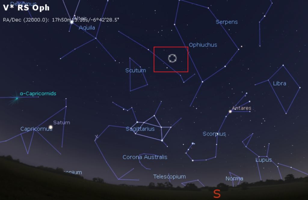With a Right Ascension (R.A.) of 17 hours 50 minutes and a Declination of -6 degrees 42.5 minutes, RS Ophiuchi lies in a corner of the constellation Ophiuchus the Serpent-Bearer, off-set but towards the galactic center. Lying very near the celestial equator, RS Ophiuchi is also well-placed for observers in both hemispheres. It's three degrees equidistant from the +4thmagnitude stars Nu and Mu Ophiuchi, and Zeta Serpentis. The region is high in the east at dusk, giving August observers a splendid opportunity to nab this recurrent nova. Be sure to check it out at dusk this week as a prelude to your Perseid vigil; RS Ophiuchi could not have erupted at a better time.