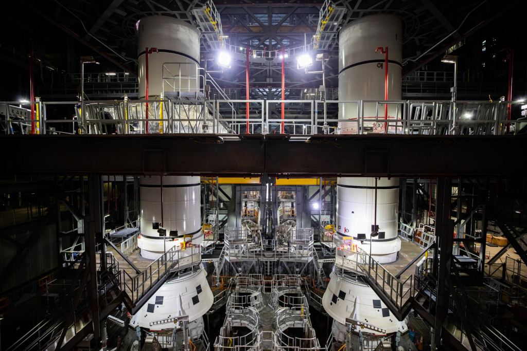 After further confirming that the Core Stage was in good condition, NASA decided in late-January to proceed with the second hot fire test. Meanwhile, work continues at NASA's Kennedy Space Center (KSC) in Florida on the solid rocket booster segment. Recently, engineers at NASA Kennedy received the third of five boosters elements, which are being stacked on the mobile launcher inside the Vehicle Assembly Building (VAB).