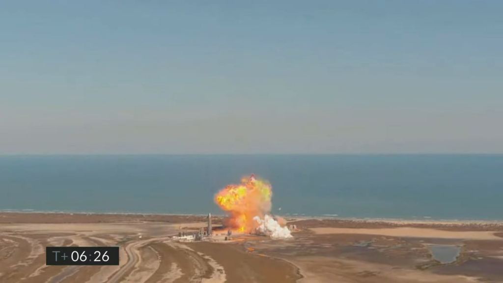 The SN9 enjoyed a stable descent, and at 2:31:35, the ground crews attempt to restart two engines and swing the fuselage back around to make a landing burn (with one engine). Unfortunately, one of the two Raptor engines sputtered and failed to reignite, which caused the SN9 to overrotate and throw off a piece of debris before landing on its side.