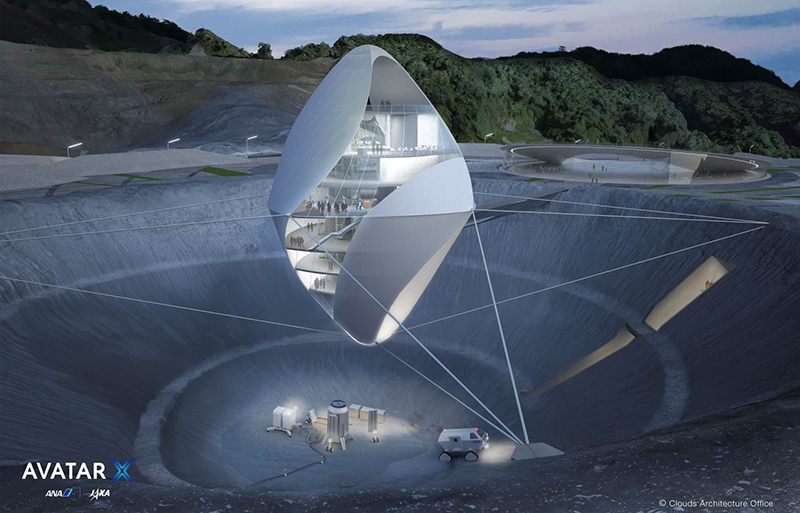 The space research center comprises the entire campus. The building suspended above the crater will be the Avatar X robotics research center. Avatar X is a partnership between JAXA (Japan Aerospace Exploration Agency) and ANA (All Nippon Airways.) They are developing so-called "Avatar" technology which will allow people to control robots remotely, as in the movie "Avatar." With Avatar X, they hope to revolutionize space exploration, resource extraction, and other space-based activities. On the Avatar X website, it says, "AVATAR X aims to capitalize on the growing space-based economy by accelerating development of real-world Avatars that will enable humans to remotely build camps on the Moon, support long-term space missions and further explore space from afar."