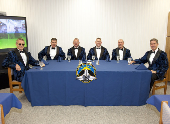 While most shuttle crews wear polo shirts or comfortable button-downs for their ceremonial pre-launch "last meal" on Earth (for a few days, anyway) the STS-132 crew decided to dress in a style befitting the occasion; the last-ever scheduled launch of space shuttle Atlantis. Very cool, but wow, I didn't know they still made tuxedos like that. Looks like something out of the 1960's! That's Piers Sellers with the shades.