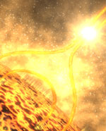 Previously, scientists believed that the particles in the solar atmosphere were accelerated when they were dragged along with the magnetic field as it snapped to a new shape, like a stone in a slingshot. However, if it were this simple, all the particles would be shot in the same direction. The new observations from RHESSI show that this is not so; heavier particles (ions) end up in a different location than lighter particles (electrons).