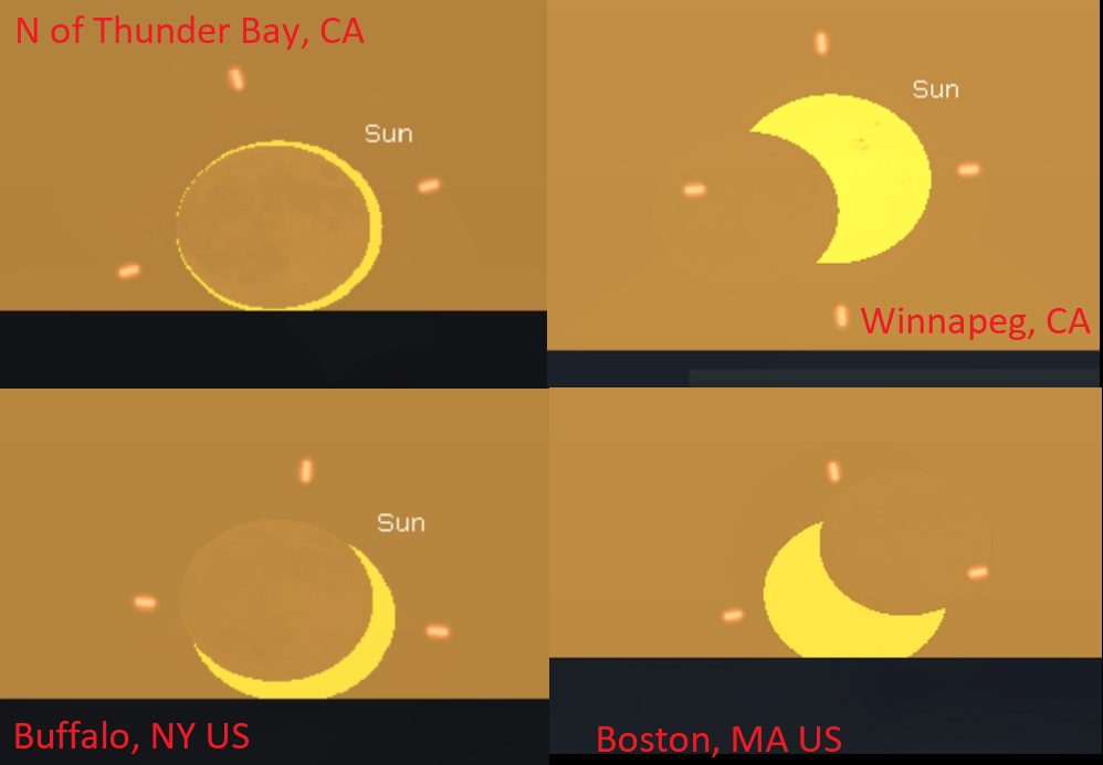 Viewing region and prospects – The good news is, millions across the northeastern half of North America, nearly all of Europe and Russia will see various stages of a partial solar eclipse. For the contiguous United States (CONUS), the line to catch a partial eclipse at sunrise runs through the Dakotas right down to Georgia… but the 'sweet spot' for a particularly photogenic 'sunrise horns' eclipse runs through the Great Lakes, right down through the New Jersey-Pennsylvania/Delaware tri-state region.