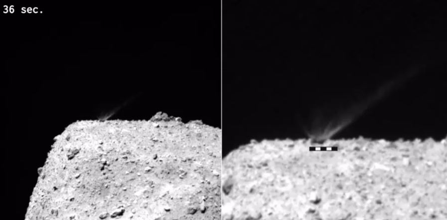 The subsurface soil collection in July 2019 was achieved by literally bombing the surface of Ryugu with the equivalent of an armour piercing anti-tank projectile. Hayabusa2 deployed a free-flying gun 500m from Ryugu's surface while itself moving to a safe location to avoid being hit by debris. Hayabusa2 also deployed a detachable camera which remained to watch the impact while Hayabusa2 was out of harm's way. The gun then detonated a explosive, launching a 2.5kg copper round at the surface.