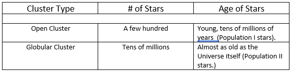 There are two kinds of star clusters: the open cluster, and the globular cluster. Open clusters are smaller than globular clusters, usually with a few hundred young stars only tens of millions of years old.
