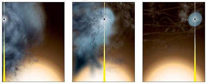 Condon and his team concluded that B3 was once a super-massive black hole at the heart of a large galaxy. B3 collided with another, larger galaxy, one with an even larger black hole. During this collision B3 had most of its stars stripped away, except for the ones closest to it. B3 is still speeding away, at more than 2000 km per second.