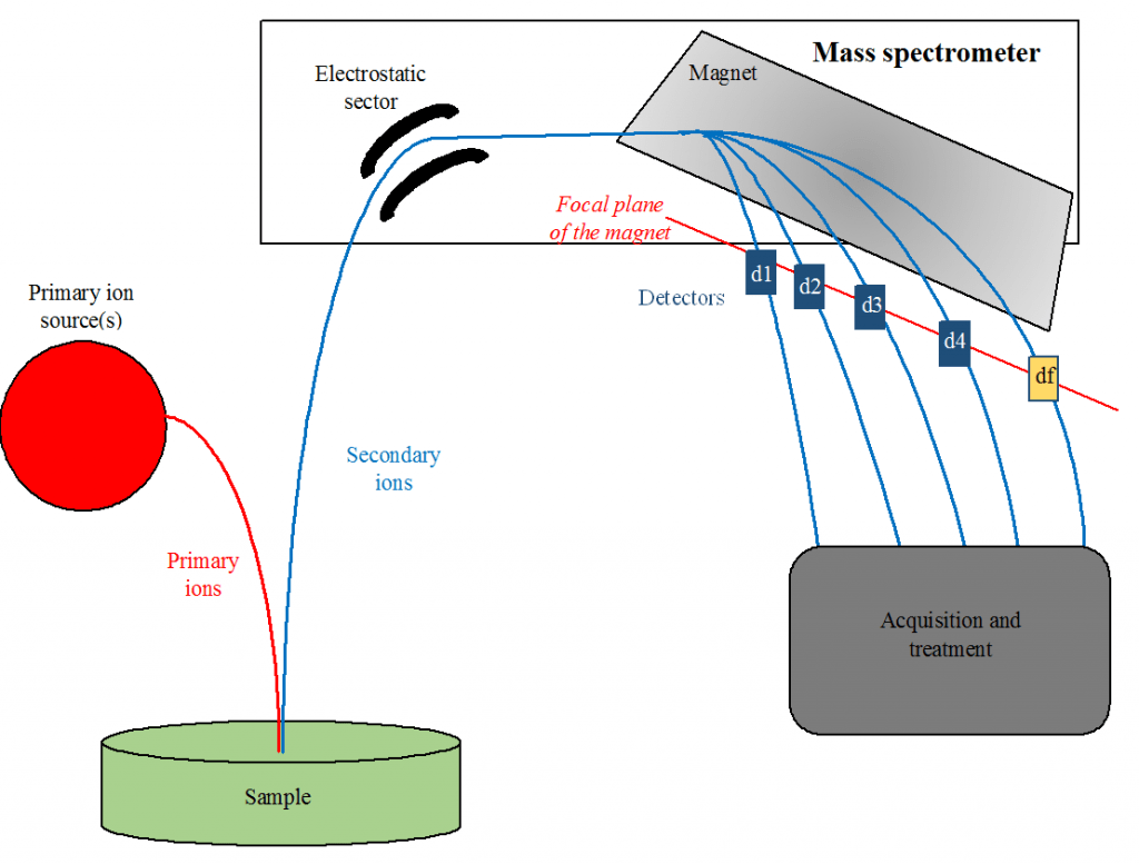 NanoSIMS stands for Nanoscale Secondary Ion Mass Spectrometry. NanoSIMS uses an ion gun to create a beam of ions. That beam is aimed at a sample, in this case the sample of the Kapoeta meteorite. The ion beam creates atomic collisions, and some of those collisions produce secondary ion particles. Those secondary ions are then fed through a mass spectrometer, which identifies the ions. As of 2018, there were just over 40 of these machines in the world.