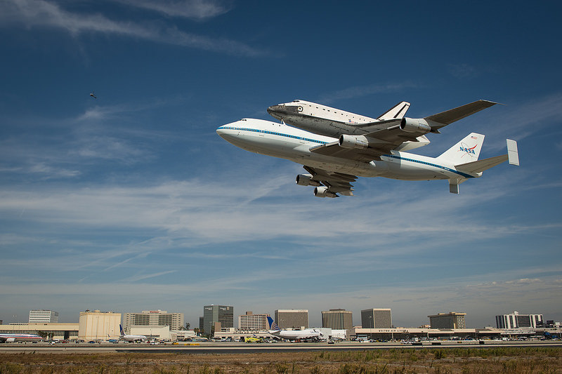 Space shuttle Endeavour, mounted atop a NASA 747 Shuttle Carrier Aircraft (SCA) performs a low flyby at Los Angeles International Airport, Friday, Sept. 21, 2012. Credit: NASA/Bill Ingalls.