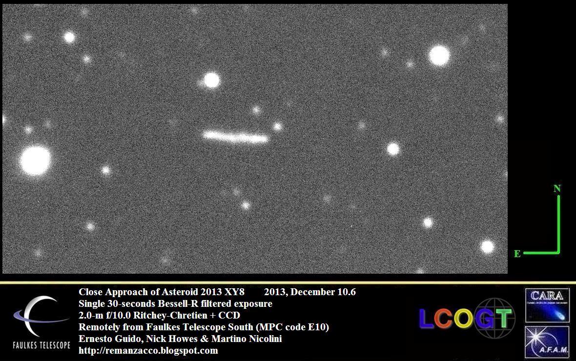 will be 11:14 UT, and its size is estimated between 31 - 68 meters. This asteroid is zipping along at about 14 kilometers per second, and of course at about 2 lunar distances away, there is no danger of this asteroid hitting Earth. The asteroid was discovered on Dec. 7 by the team at the Catalina Sky Survey, and our friends Ernesto Guido, Nick Howes and Martino Nicolini from the Remanzacco Observatory have provided a follow-up image of the asteroid, taken just this morning.
