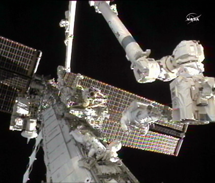 Image above: Expedition 24 Flight Engineers Doug Wheelock (right) and Tracy Caldwell Dyson work to replace a failed ammonia pump module outside of the International Space Station. Credit: NASA TV[/caption]