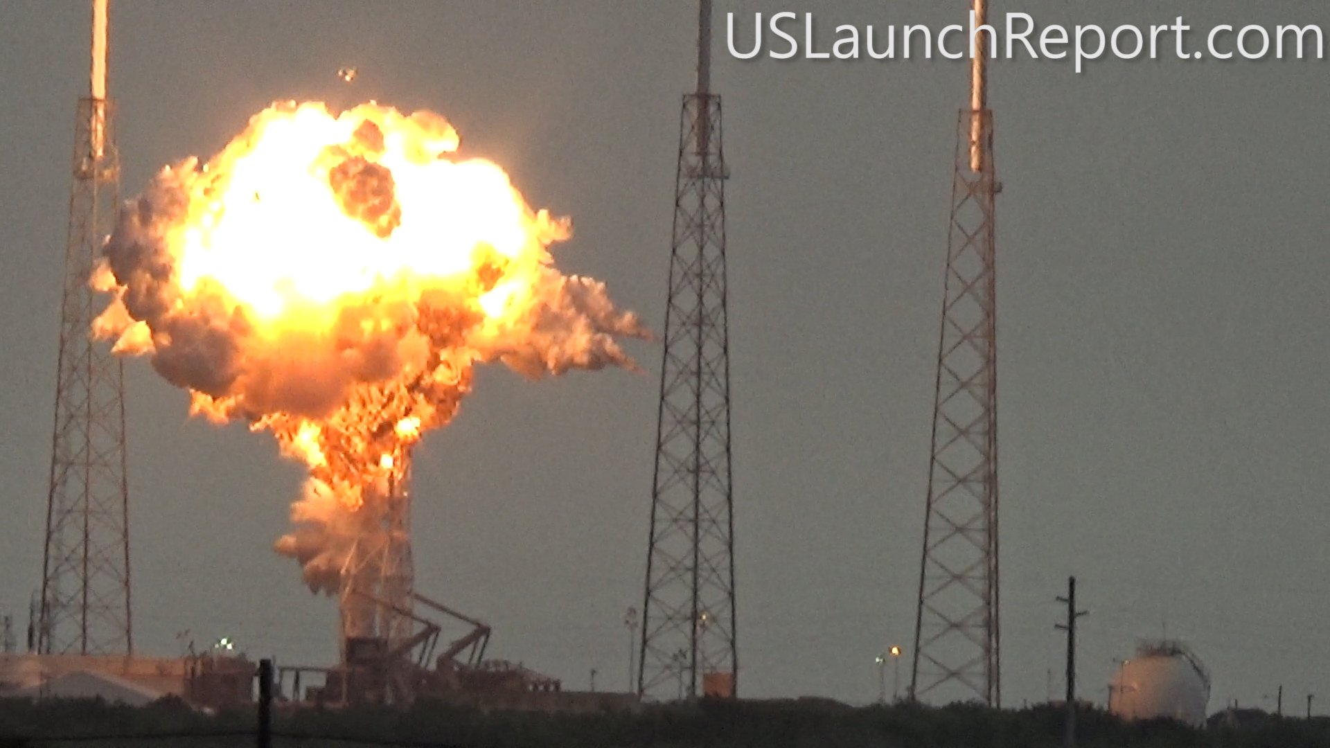 SpaceX Falcon 9 rocket moments after catastrophic explosion destroys the rocket and Amos-6 Israeli satellite payload at launch pad 40 at Cape Canaveral Air Force Station, FL, on Sept. 1, 2016. A static hot fire test was planned ahead of scheduled launch on Sept. 3, 2016. Credit: USLaunchReport[/caption]