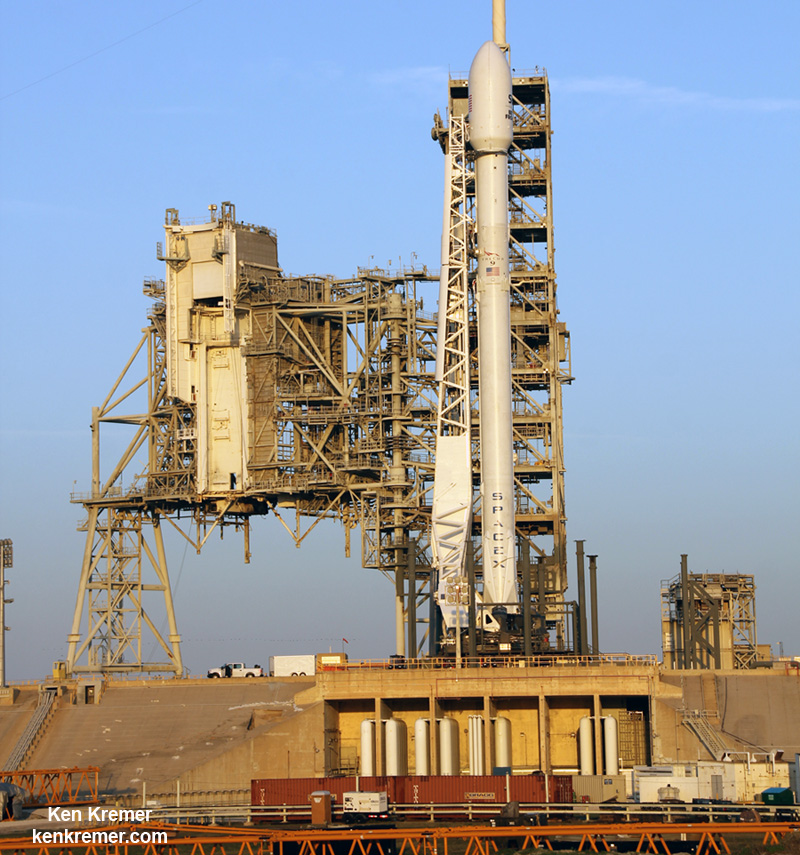 SpaceX Falcon 9 recycled rocket carrying SES-10 telecomsat poised atop Launch Complex 39A at the Kennedy Space Center ahead of liftoff slated for 6:27 p.m. on 30 Mar 2017 on world's first reflight of an orbit class rocket. Credit: Ken Kremer/Kenkremer.com[/caption]