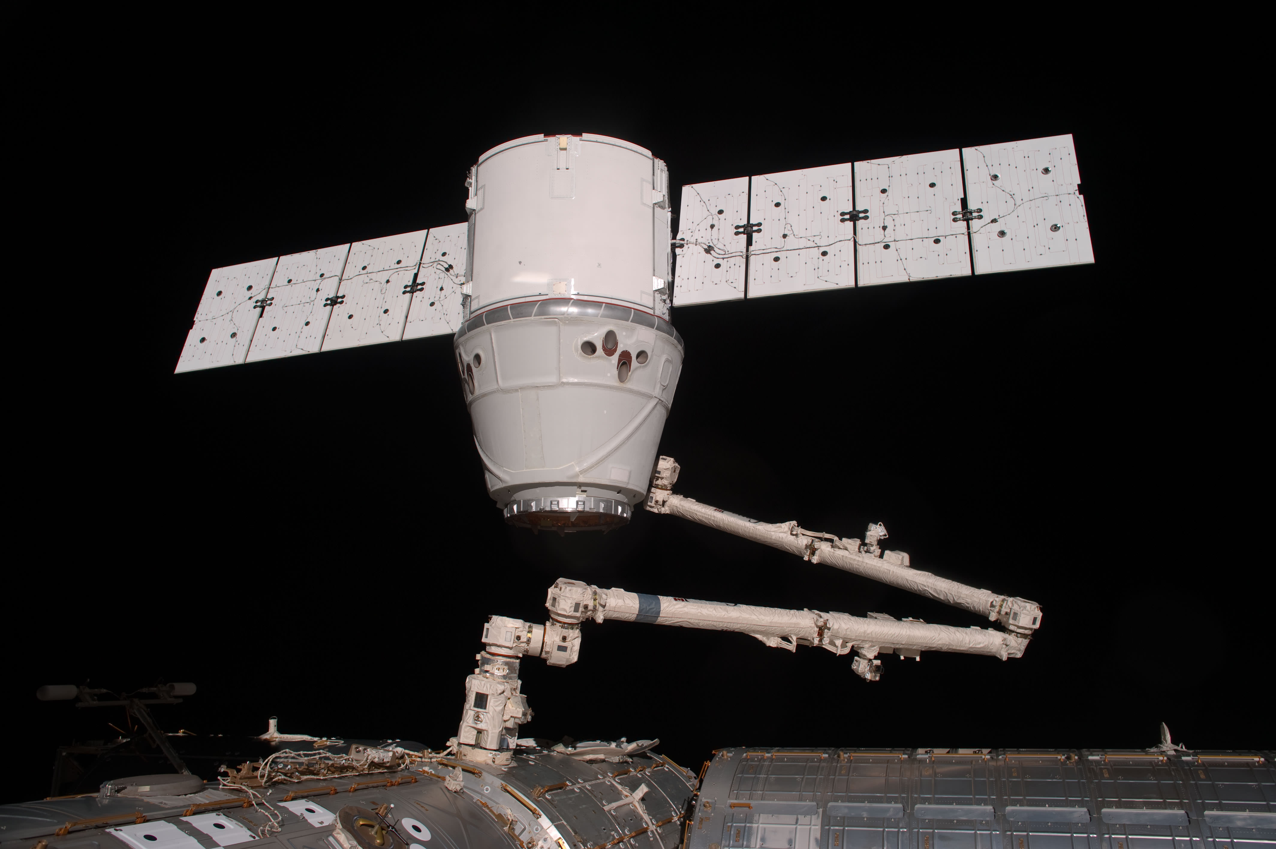 [caption id="attachment_95528" align="aligncenter" width="580" caption="Capturing SpaceX's Dragon. With clouds and land forming a backdrop, the SpaceX Dragon commercial cargo craft is grappled by the Canadarm2 robotic arm at the International Space Station. Expedition 31 Flight Engineers Don Pettit and Andre Kuipers grappled Dragon at 9:56 a.m. EDT and used the robotic arm to berth Dragon to the Earth-facing side of the station's Harmony node at 12:02 p.m. May 25, 2012. Dragon became the first commercially developed space vehicle to be launched to the station to join Russian, European and Japanese resupply craft that service the complex while restoring a U.S. capability to deliver cargo to the orbital laboratory. Dragon is scheduled to spend about a week docked with the station before returning to Earth on May 31 for retrieval. Credit: NASA"]