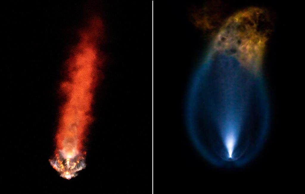 The first stage separated at 2m45s into the mission, followed by the second stage ignited its Merlin engine. At 5 minutes, the first and second stages began picking up light from the Sun, which created a "jellyfish effect" in the night sky. This was accompanied by the first stage firing its cold gas thrusters to reorient itself for reentry, which produced a flashing effect in the sky. All of this came together to create a stunning visual display of bright lights in the night sky.