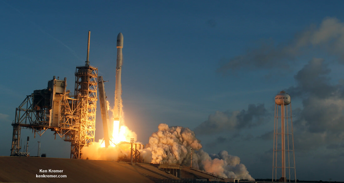 SpaceX Falcon 9 rocket carrying classified NROL-76 surveillance satellite for the National Reconnaissance Office successfully launches shortly after sunrise from Launch Complex 39A on 1 May 2017 from NASA's Kennedy Space Center in Florida. 1st stage accomplished successful ground landing at the Cape nine minutes later. Credit: Ken Kremer/Kenkremer.com[/caption]