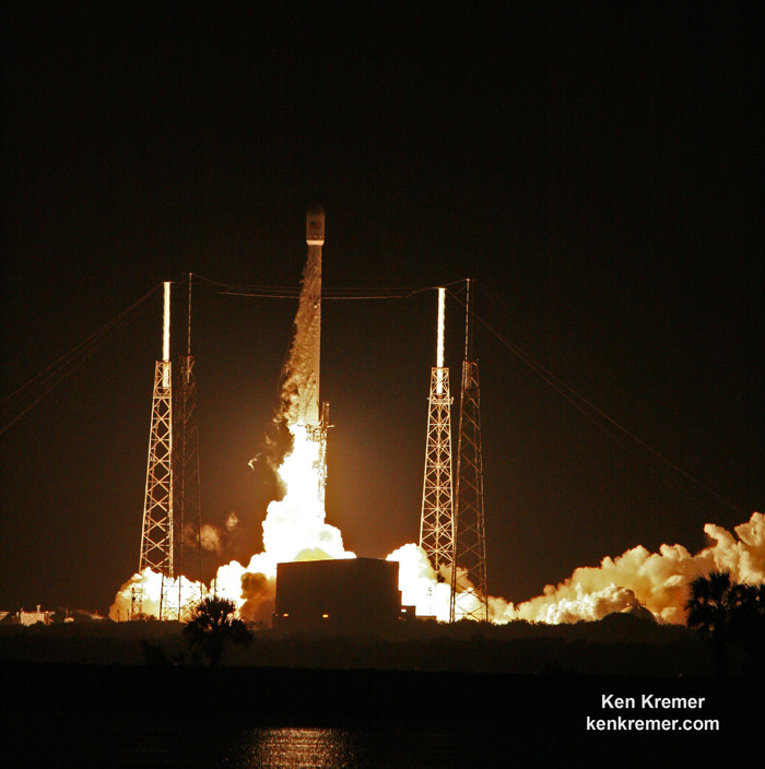 Launch of SpaceX Falcon 9 carrying JCSAT-16 Japanese communications satellite to orbit on Aug. 14, 2016 at 1:26 a.m. EDT from Space Launch Complex 40 at Cape Canaveral Air Force Station, Fl. Credit: Ken Kremer/kenkremer.com [/caption]