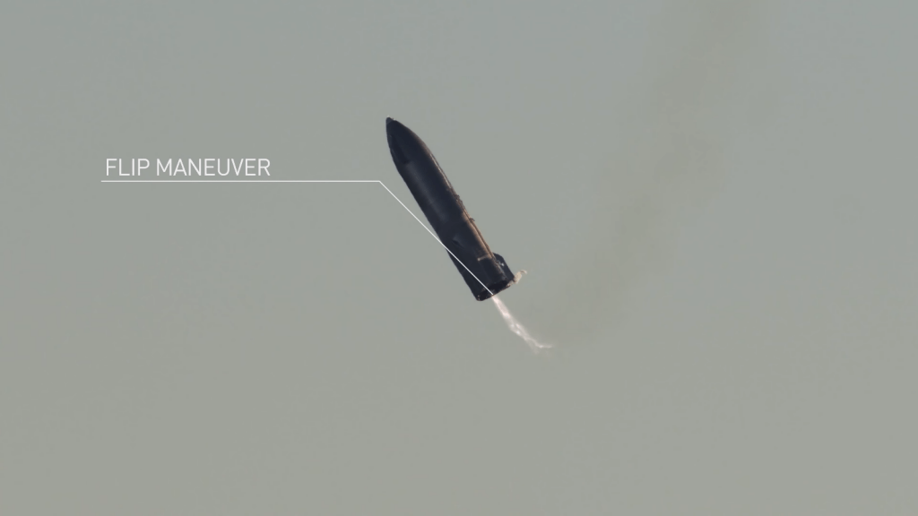 Then comes the "flip manuever," where two of the Raptors reignite and gimbal in order to bring the tail around for landing. This is shown from both the side (drone cam) and the ground. The engines them flame up for the landing burn, but fail to slow the SN8 down enough for it to make a soft landing. The touch down and Rapid Unscheduled Disassembly (RUD) - aka. explosion - ensue.