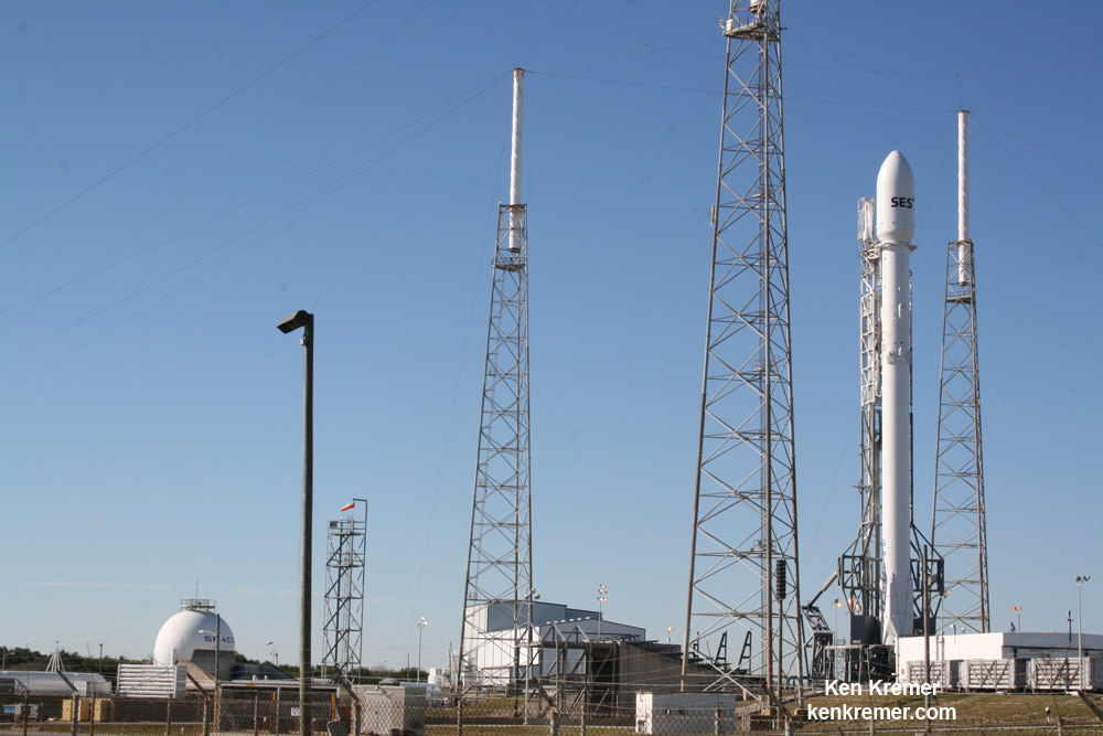 Upgraded SpaceX Falcon 9 awaits launch of SES-9 communications satellite on Feb. 25, 2016 from Pad 40 at Cape Canaveral, FL. Credit: Ken Kremer/kenkremer.com[/caption]