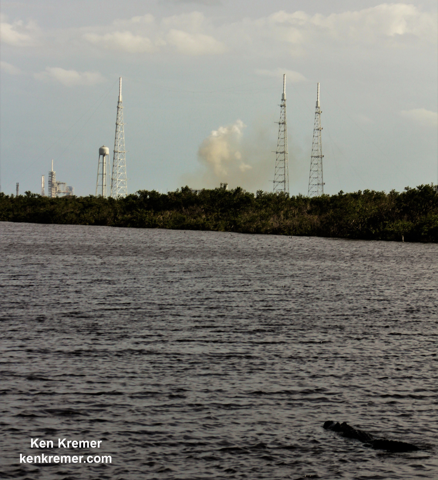 SpaceX conducts successful static hot fire test of recycled Falcon 9 at Launch Complex 39A at the Kennedy Space Center on 2 Oct 2017 as a gator gazes from Playalinda waterways, FL. Liftoff is slated for 7 Oct 2017 with SES-11/EchoStar 105 telecommunications comsat. Credit: Ken Kremer/Kenkremer.com