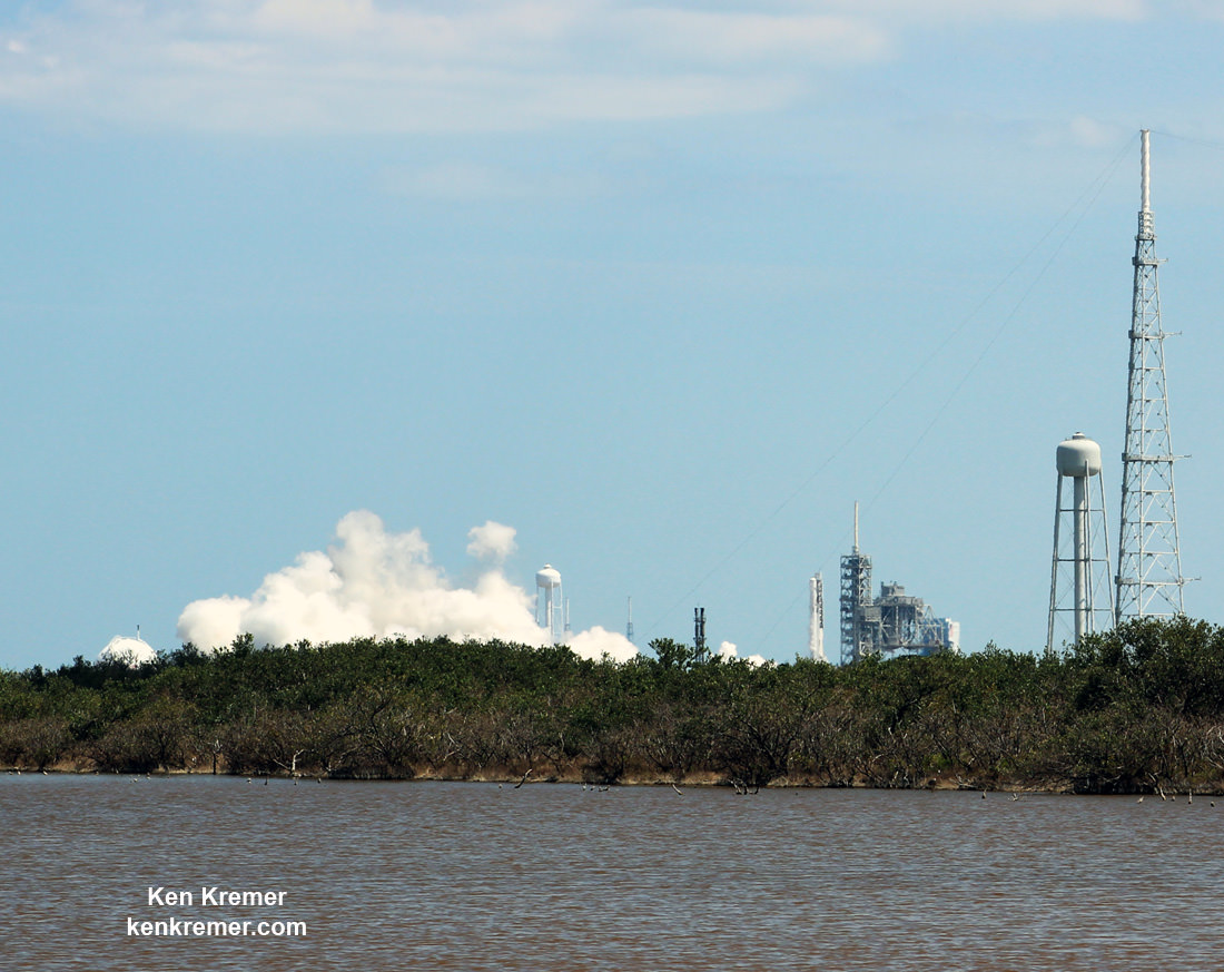 SpaceX conducts successful static hot fire test of Falcon 9 booster atop Launch Complex 39A at the Kennedy Space Center on 25 Apr. 2017 as seen from Merritt Island National Wildlife Refuge, Titusville, FL. The Falcon 9 is slated to launch the NROL-76 super secret spy satellite for the U.S. National Reconnaissance Office (NRO) on 30 April 2017. Credit: Ken Kremer/Kenkremer.com[/caption]