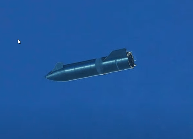 At close to 4:42 minutes into the flight, the SN8 achieved its target altitude of 12.5 km (~7.8 mi; 41,000 ft) and the Raptor engines were shut off. The SN8 coasted in the air for a moment before commencing its descent and tilting its fuselage towards the ground. This was the much-anticipated " belly-flop " maneuver, which tested the spacecraft's maneuvering flaps and aerodynamic surfaces.