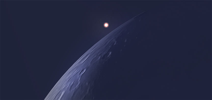 The edge or limb of the Moon appears smooth to the eye, but it's rife with polar mountain peaks. As Aldebaran creeps along the craggy limb, it will repeatedly flash in and out of view as peaks and cliffs momentarily block it from sight. And here's the truly amazing thing. Observers along the western section of the graze line, where the event takes place in fairly dark sky, can watch the star blink in and out of view without optical aid when it reaches the dark part of the lunar disk. Wow!