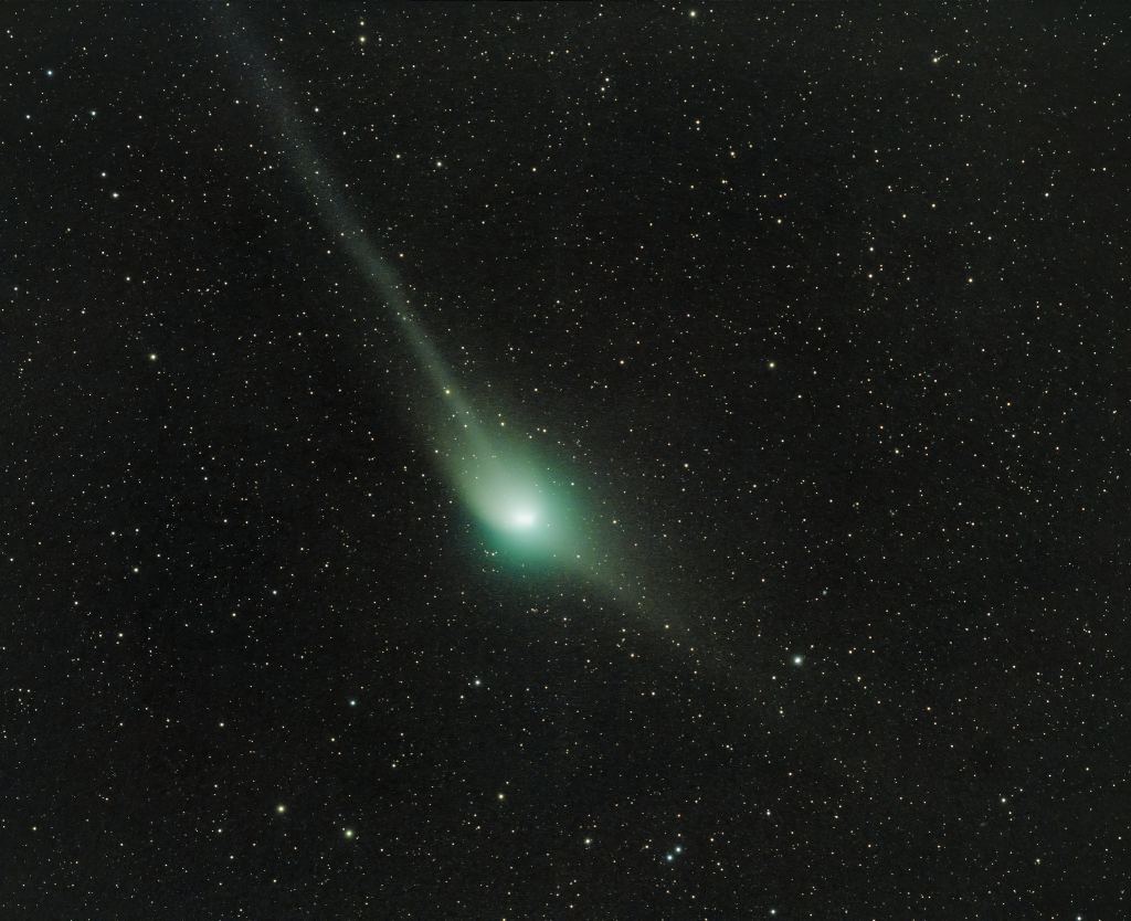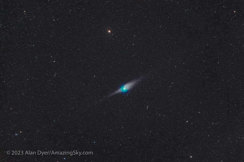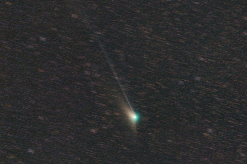 Chris said he carefully processed the head region of the comet so it clearly shows the star-like nucleus of the comet surrounded by a teal-green glow from ionized carbon atoms.