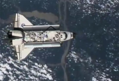 Station astronauts Jeff Williams and Nicole Stott had about 90 seconds to photograph Atlantis' belly while aiming 800 mm and 400 mm telephoto lenses respectively through portholes on the Russian Zvezda module. They snapped hundreds of digital photographs which were quickly down linked for analysis by teams waiting in Houston. The spectacular show was carried live on NASA TV. [caption id="attachment_45562" align="alignnone" width="400" caption="Atlantis cargo bay carrying spare parts for installation on the ISS with earth in the background. Credit: NASA "]