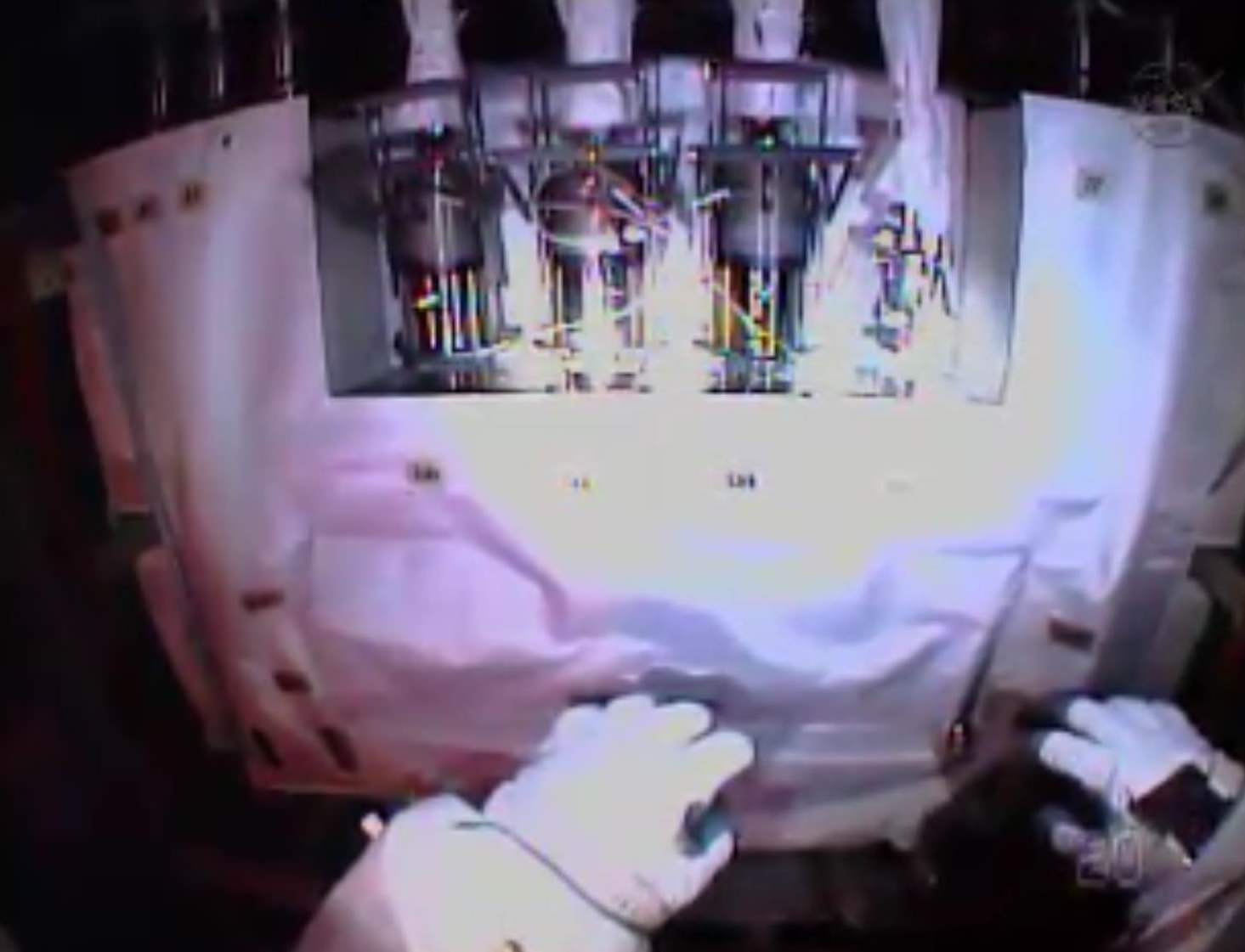 The most spectacular television shots occurred towards the end of the five-hour, 28-minute spacewalk when Mastracchio carefully wrestled the 800-pound ammonia pump module out of its spot on the space station while riding aboard Canadarm2. (Controlling the arm was Japanese astronaut Koichi Wakata, guided by CapCom and fellow Japanese astronaut Aki Hoshide on the ground.)