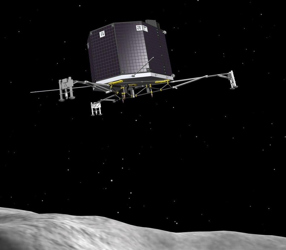 Artist's impression of the Rosetta spacecraft releasing its lander, Philae, above the surface of Comet 67P/Churyumov–Gerasimenko in November 2014. Credit: ESA–C. Carreau/ATG medialab[/caption]