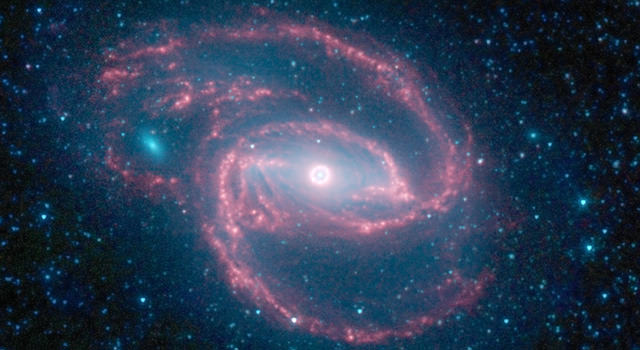 In the Spitzer image, infrared light with shorter wavelengths is blue, while longer-wavelength light is red. The galaxy's red spiral arms and the swirling spokes seen between the arms show dust heated by newborn stars. Older populations of stars scattered through the galaxy are blue.