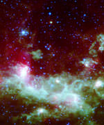 The new Spitzer picture provides a detailed snapshot of this universal phenomenon. By imaging Henize 206 in the infrared, Spitzer was able to see through blankets of dust that dominate visible light views. The resulting false-color image shows embedded young stars as bright white spots, and surrounding gas and dust in blue, green and red. Also revealed is a ring of green gas, which is the wake of the ancient supernova's explosion.