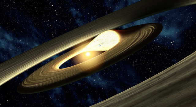 Astronomer are seeing the light from this disk varying quite frequently. One possible explanation is that a close companion to the star -- either a star or a developing planet -- could be shoving planet-forming material together, causing its thickness to vary as it spins around the star.