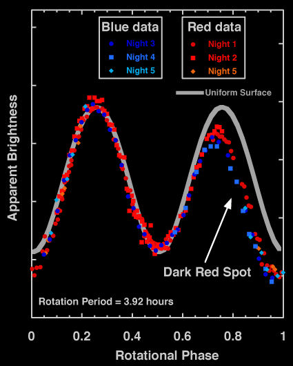 A dark red area discovered on dwarf planet Haumea appears to be richer in minerals and organic compounds than the surrounding icy surface. Since Haumea is so small and far away, it shows up in telescopes as just a point of light, but the spot was discovered by measuring changes in brightness as it rotates. Small but persistent differences indicate that the dark spot is slightly redder in visible light and slightly bluer at infrared wavelengths.