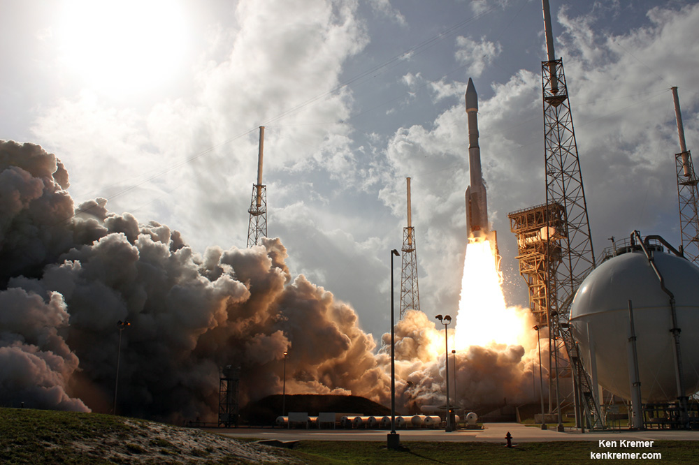 Fiery blastoff of a United Launch Alliance (ULA) Atlas V rocket carrying the EchoStar XIX satellite from Space Launch Complex-41 on Cape Canaveral Air Force Station, Fl., at 2:13 p.m. EST on Dec. 18, 2016. Credit: Ken Kremer/kenkremer.com[/caption]