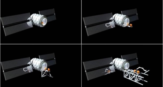 Beams are constructed in space "just like a giant erector set", according to a statement from John Strickland, SDSC chief analyst. This would be accomplished using "robots on rails" that could build the first part, then "extend ... its own rails along the beam as it goes."