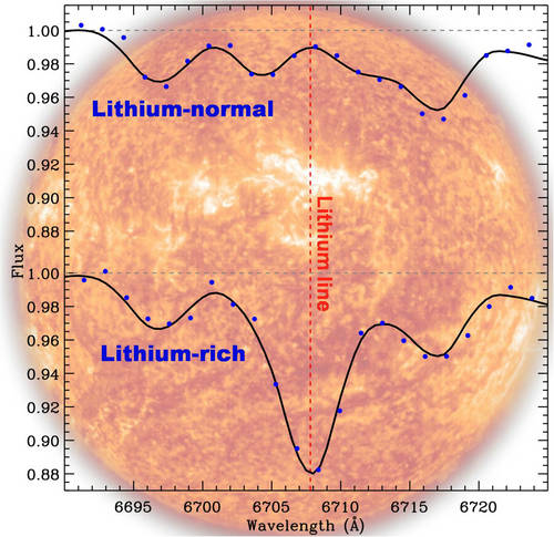But lithium-rich giants only make up about 1% of red giant stars. Other than their high lithium abundance, they are similar in age, mass, and brightness to other red giants. What could trigger some red giants to produce lithium, but not all of them?