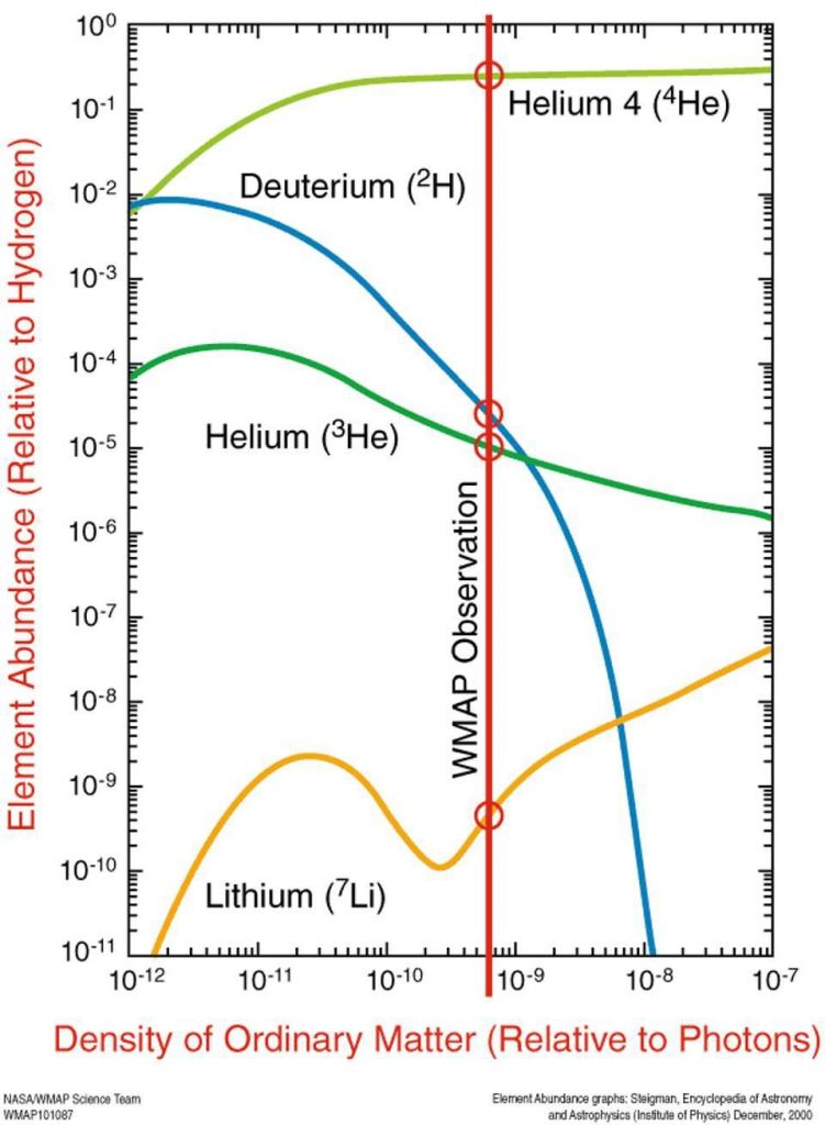 In the beginning, the big bang created three elements: hydrogen, helium, and lithium. But it only produced a trace of lithium. For every lithium atom created, the big bang produced about 10 billion hydrogen atoms, and 3 billion helium atoms. The ratio of primordial elements is one of the triumphs of the big bang model. It predicts the ratio of hydrogen (H) and helium (4He) perfectly, and even works for the ratios of other isotopes, such as deuterium (2H) and helium-3 (3He). But it doesn't work for lithium, and we aren't sure why.
