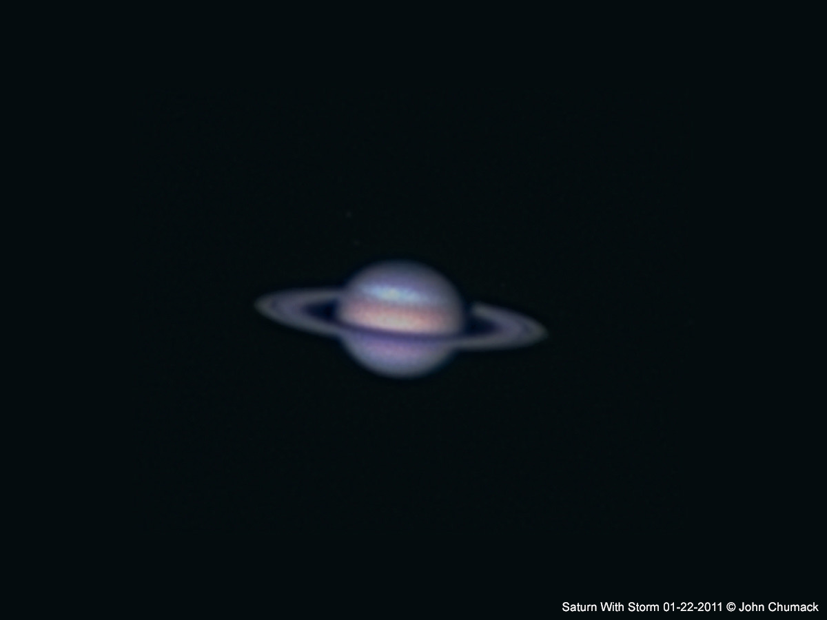 Despite sub-zero temperatures and significant snow cover, at least one dedicated observer has been getting up early to observe what we rarely see - a change in Saturn's pale golden face. "I was out from 4:30am to 6:00am early Saturday morning. I brushed all the snow off my Dome, and spent an hour or so shooting Saturn with its Big White Storm brewing in the cloud tops." say John Chumack of Dayton, Ohio. "The seeing conditions were not the best, but I went for it anyway, after the high cirrus clouds moved out of the way, I had to try! -3F Temps in my backyard in Dayton, OH nearly killed my attempt."