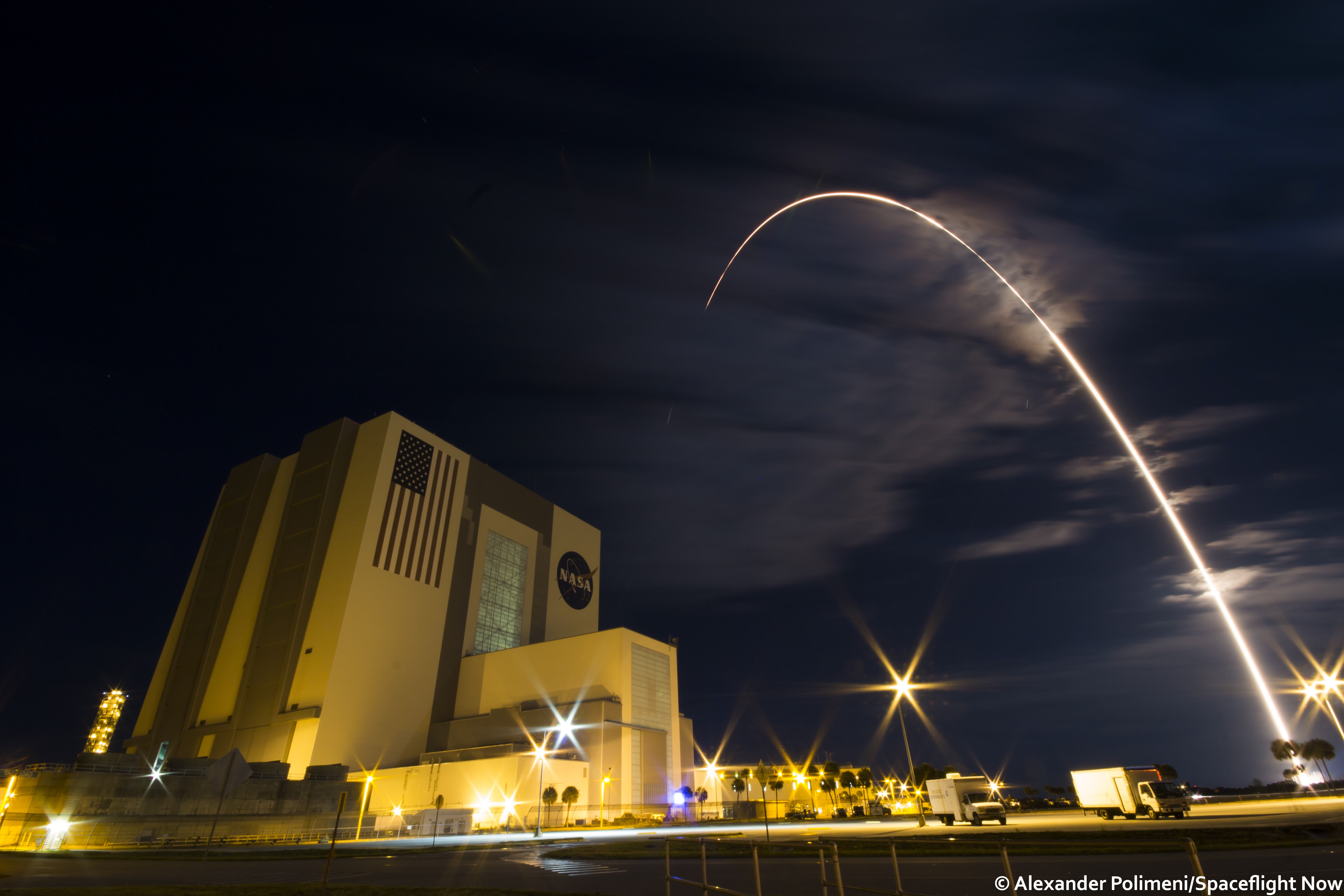 Long exposure streak shot of blastoff of United Launch Alliance Atlas V rocket carrying Orbital ATK's Cygnus spacecraft at 11:05 p.m. EDT on March 22, 2016, with foreground view of world famous Vehicle Assembly Building (VAB) at NASA's Kennedy Space Center in Florida. Atlas V lifted off from nearby Space Launch Complex 41 on Cape Canaveral Air Force Station in Florida. Credit: Alex Polimeni/Spaceflight Now [/caption]