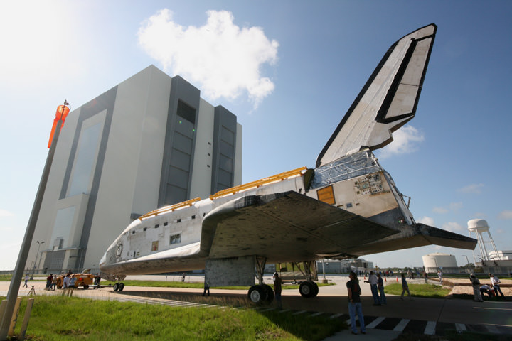 [caption id="attachment_87513" align="aligncenter" width="580" caption="Rear view of Discovery beside VAB. Credit: Ken Kremer"]