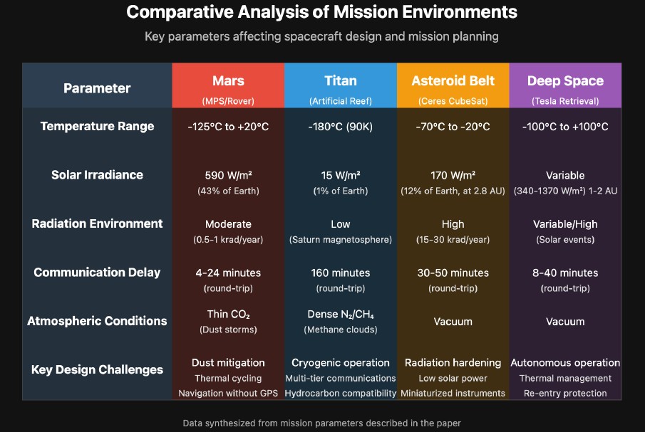 The paper covers a wide range of topics, but it can fundamentally be broken down into four different “missions”, each of which have their own requirements. First is a Mars positioning system, similar to the Global Positioning System on Earth. Next is creating an artificial reef on Titan for the purposes of exploring the hydrocarbon oceans there for life. Then launching a CubeSat to Ceres, and finally collecting and returning to Earth the famous Tesla Roadster that was launched as part of a SpaceX marketing campaign.