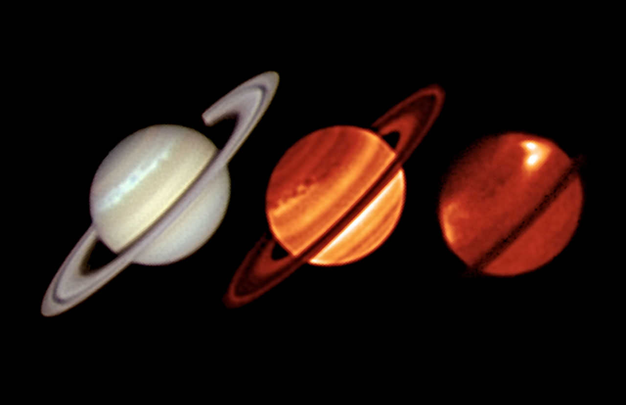 The image above shows three views of Saturn acquired on January 19: one by amateur astronomer Trevor Barry taken in visible light and the next two by the VLT's infrared VISIR instrument – one taken in wavelengths sensitive to lower atmospheric structures one sensitive to higher-altitude features.