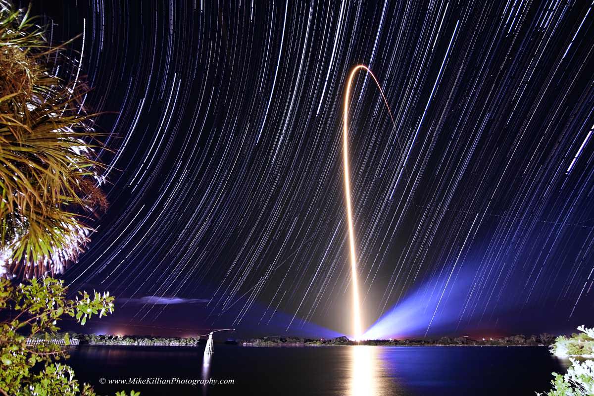 Killian's very creative image makes it looks as though the fiery rocket plume is slicing and dicing a path though the wandering stars as its thundering off the pad, arcing out over the Atlantic Ocean and soaring on to orbit.