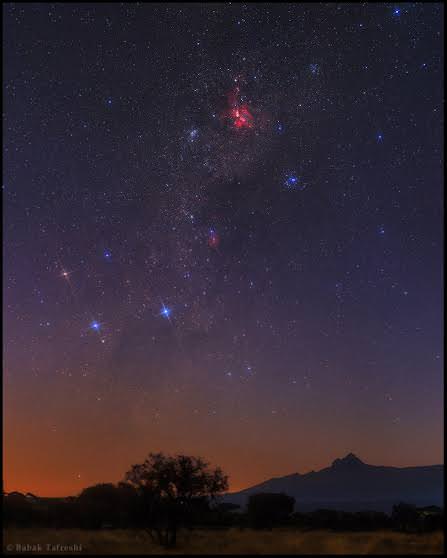 Giraffes and acacia trees against the spectacular moonlit backdrop of Mount Kilimanjaro, as seen from Amboseli National Park, Kenya. The head of a zebra is also visible on the left. The main peak of Kilimanjaro is Kibo that reaches 5,895 m (19,341 ft). The smaller peak is Mawenzi at 5,149 m (16,893 ft) and meaning the moon in Swahili. Credit and copyright: Babak A. Tafreshi.[/caption]