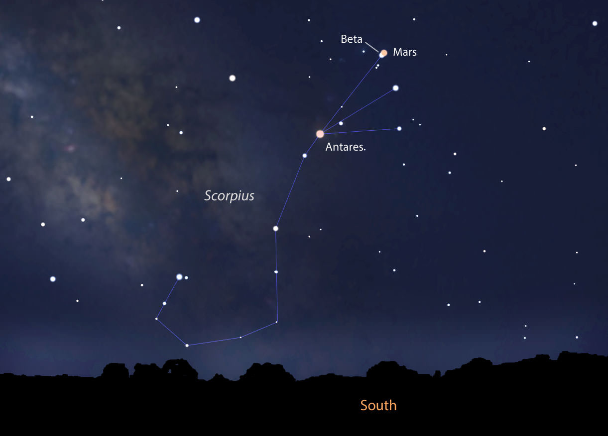 Face south tomorrow morning at the start of dawn and you might have to look twice for Beta Scorpii. Bright Mars stands right next to the star and will pass very close to the star on Wednesday morning, March 16. Diagram: Bob King, source: Stellarium[/caption]